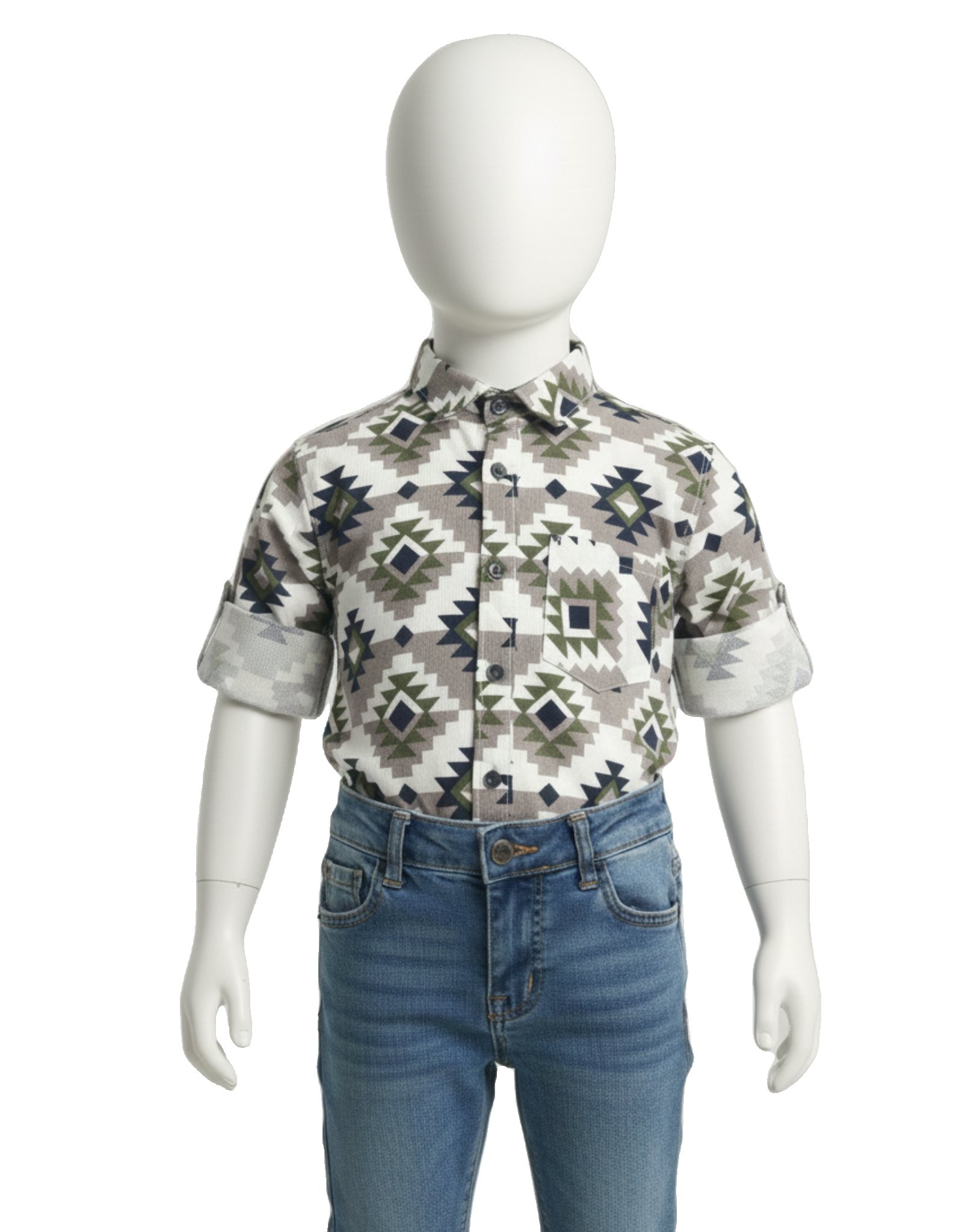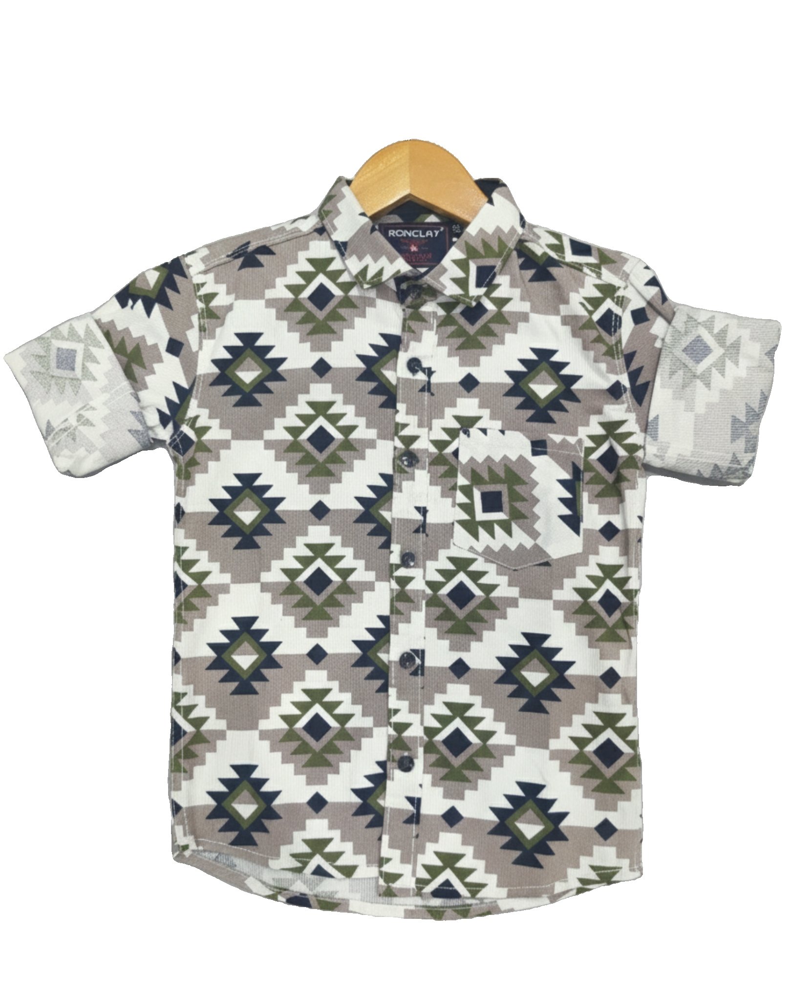 Give your little one a stylish edge with this trendy tribal print shirt. Designed with a mix of earthy tones—olive green, navy blue, beige, and white—this shirt stands out with its bold geometric pattern. The soft, breathable fabric ensures comfort, while the classic collar and front pocket add a touch of smart casual charm.
