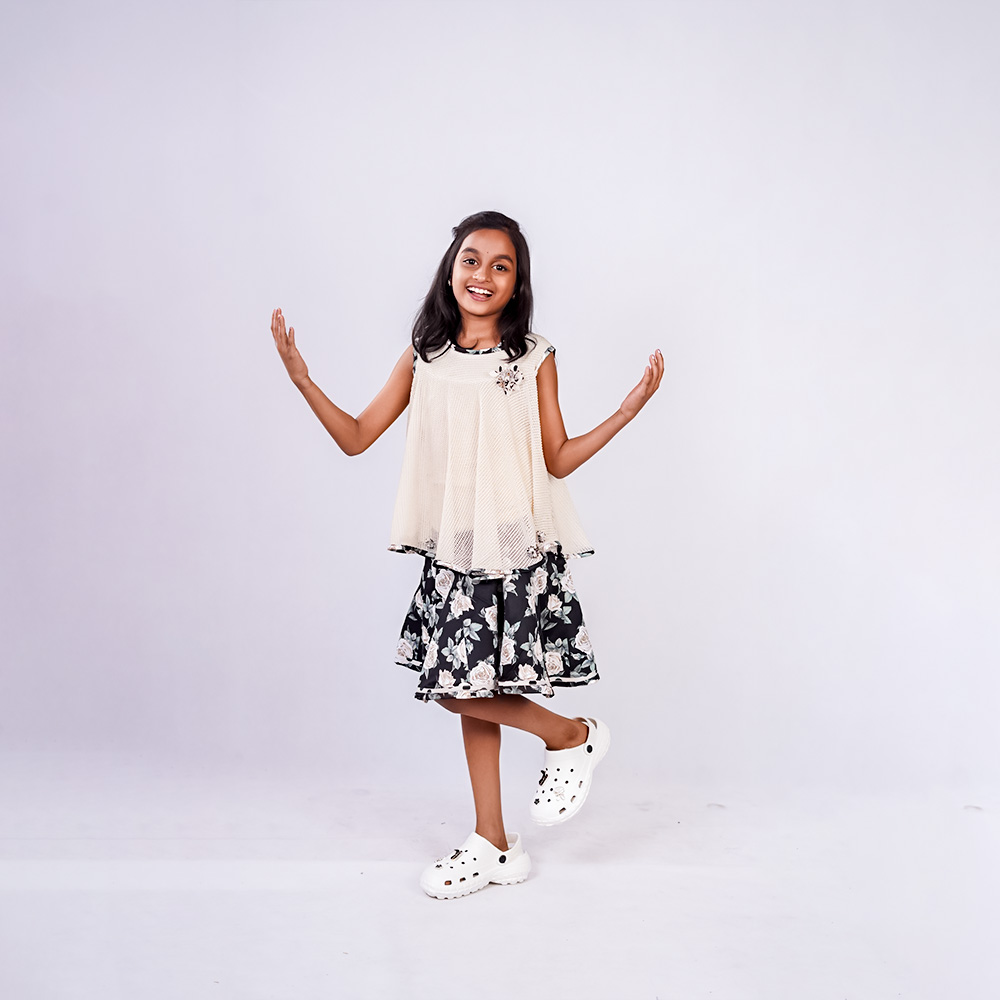 A stylish floral top featuring a mix of cool tones—primarily blue, green, and white. The top has a structured collar and voluminous sleeves, giving it a trendy. The pants are flowy and comfortable, enhancing both style and ease of movement. The wide-leg design adds a contemporary flair and balances the fitted structure of the top Fabric: Cotton Polyester.