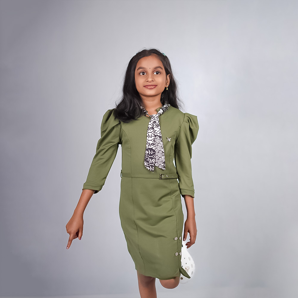 This chic olive-green dress, perfect for formal events, school functions, or stylish day outs. Tailored with a slim silhouette and structured shoulders, this dress brings a polished look while maintaining comfort. Fabric: Cotton spandex
