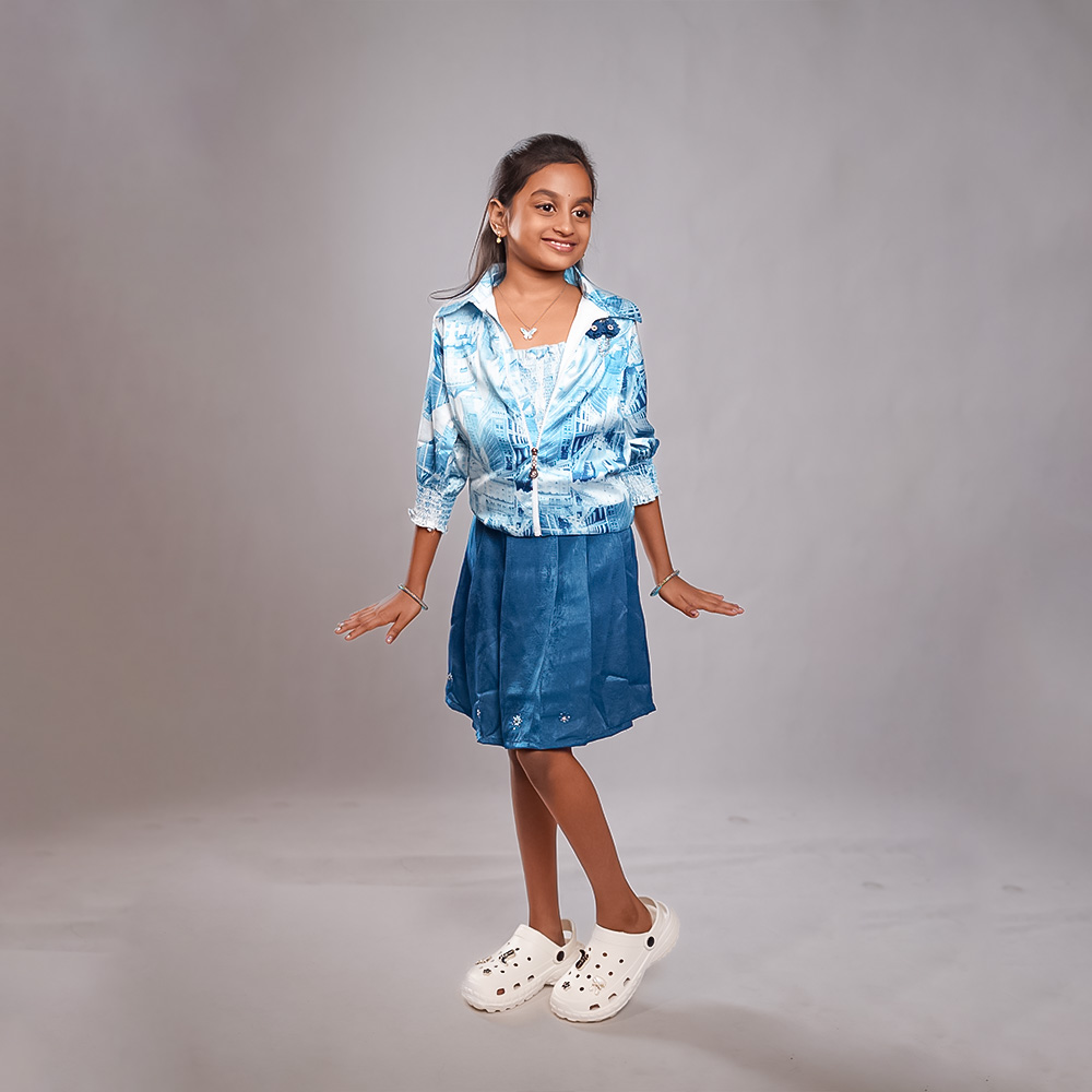 This set includes a zip-up jacket and matching skirt, designed for comfort and charm. The top is styled like a light jacket with a collar and cuffed sleeves, adorned with an eye-catching urban print. A-line skirt with soft pleats and floral embroidery. Fabric: Cotton Polyester