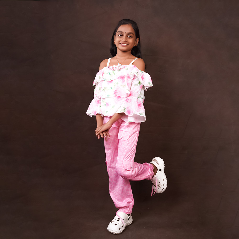 Crafted from a lightweight, off-shoulder layered top bursts with charm in a white base adorned with pink rose Paired with comfy pink jogger pants featuring a stylish geometric print and flap pockets. Fabric: Cotton polyester