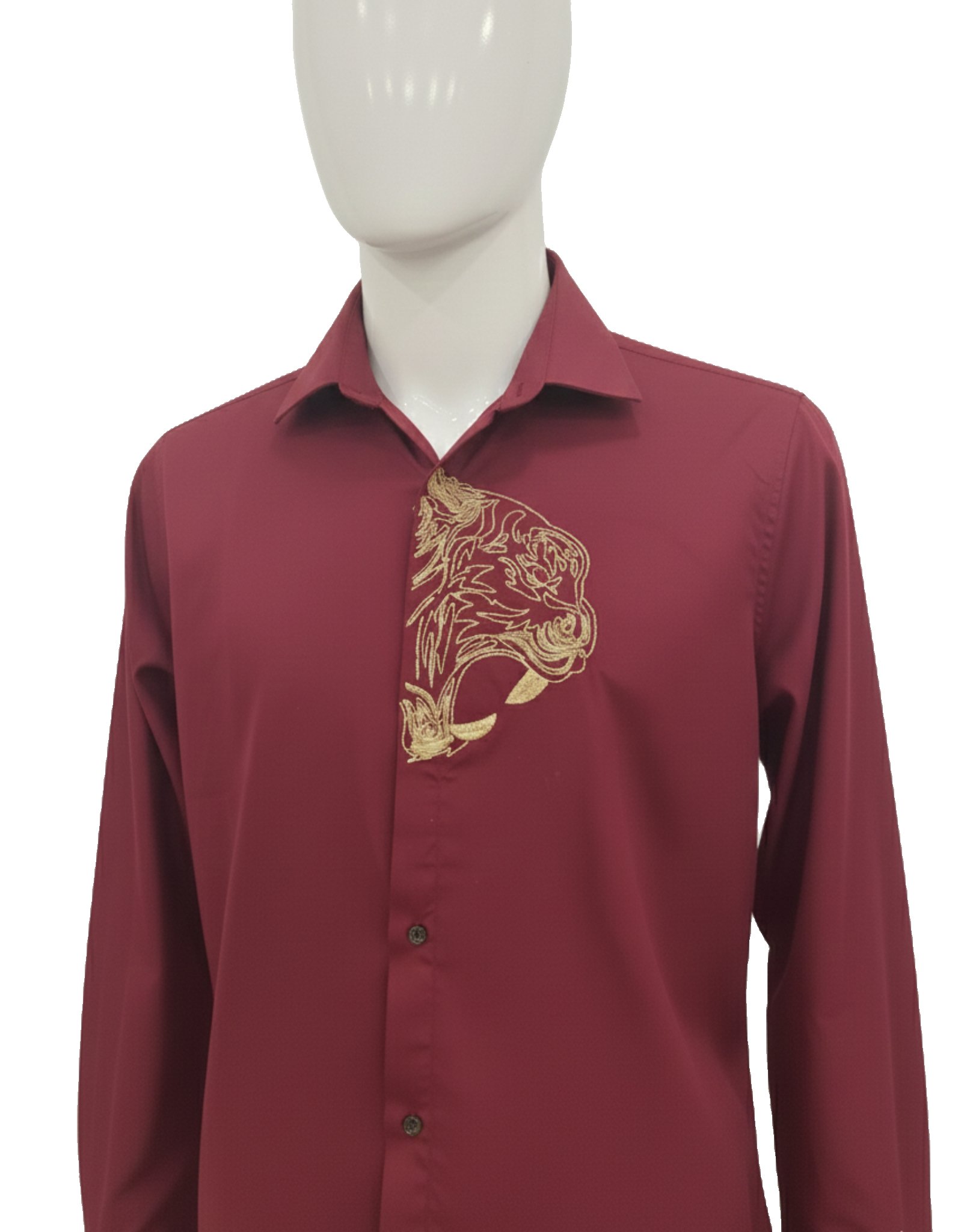 Elevate your style with this sophisticated maroon long-sleeve shirt, featuring a striking gold embroidered motif on the front. Crafted from smooth, lightweight fabric, it offers both comfort and refinement—perfect for formal events, festive occasions, or stylish everyday wear. The classic collar and button-down front add a timeless touch, while the intricate embroidery provides a unique statement that sets this shirt apart.