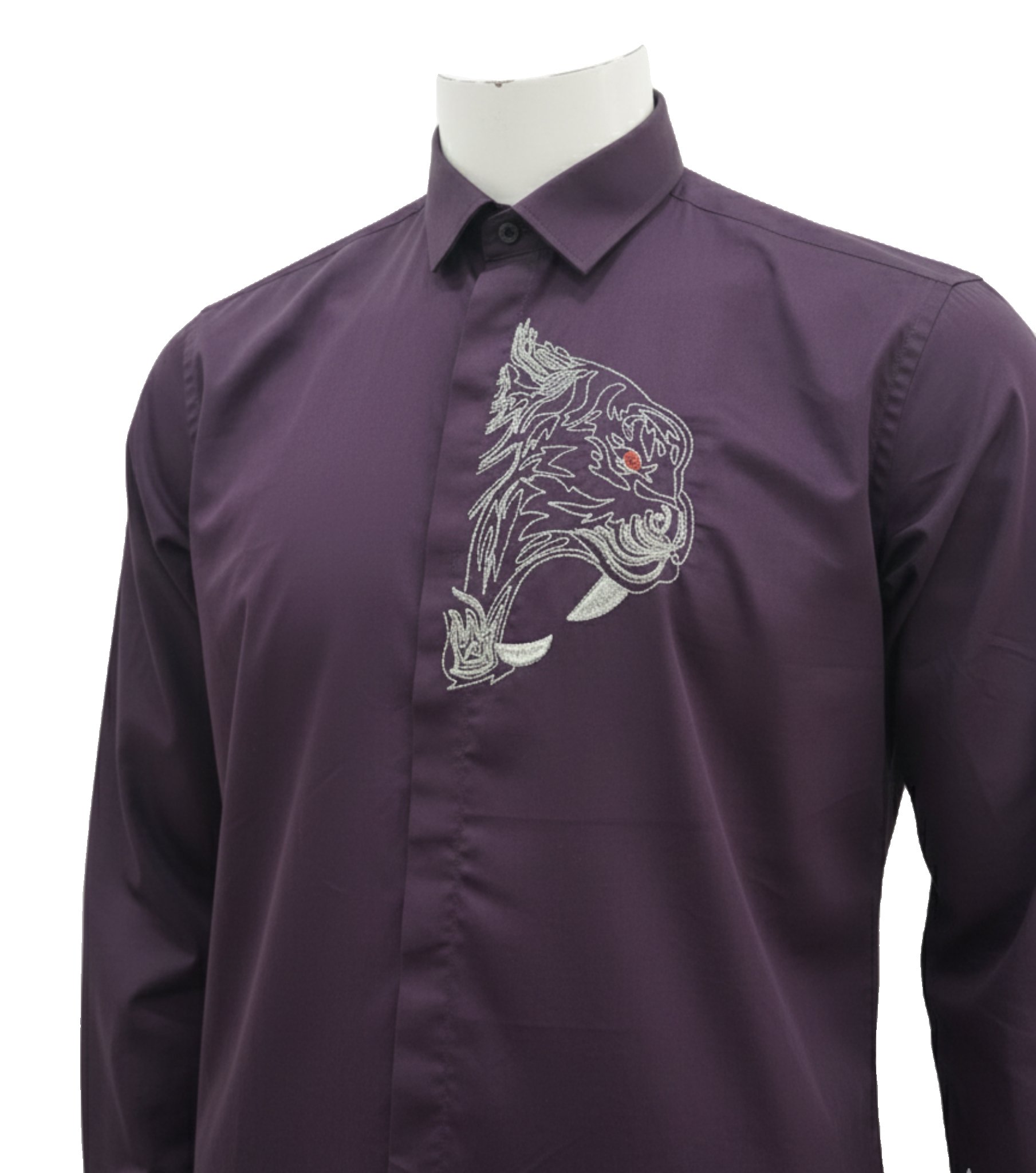 Elevate your style with this sophisticated Purple long-sleeve shirt, featuring a striking gold embroidered motif on the front. Crafted from smooth, lightweight fabric, it offers both comfort and refinement—perfect for formal events, festive occasions, or stylish everyday wear. The classic collar and button-down front add a timeless touch, while the intricate embroidery provides a unique statement that sets this shirt apart.